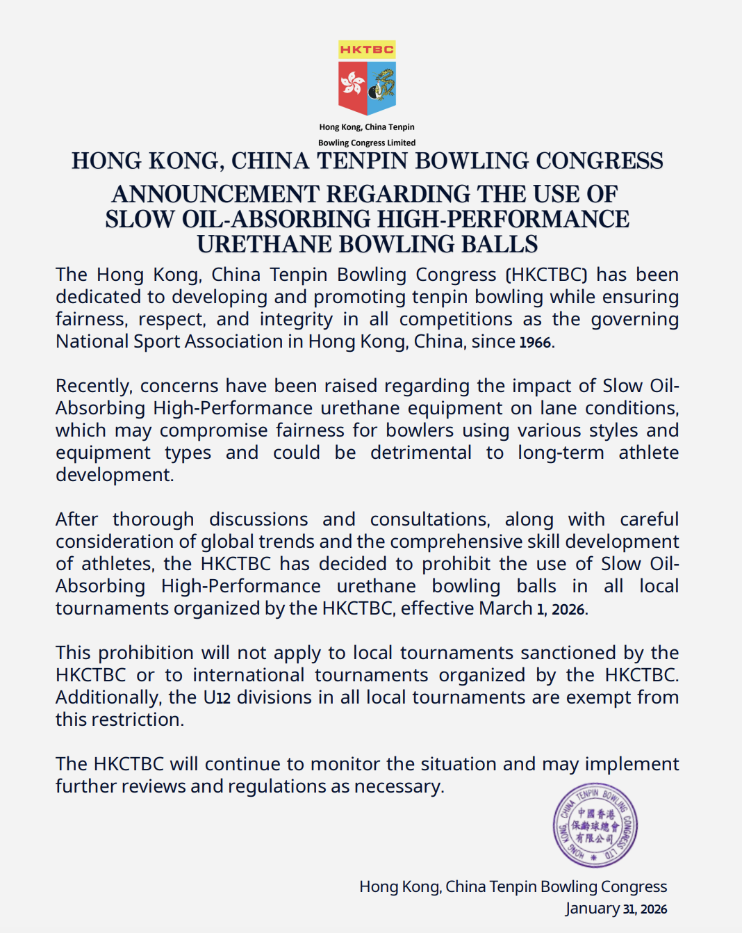 Bellow is the official statement of the HKTBC regarding urethane bowling ball ban.